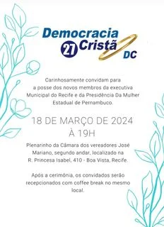 O Partido da Democracia Cristã 27 empossará logo mais às 19:00h desta segunda-feira (18), a nova Executiva Municipal do Recife, cuja solenidade ocorrerá no Plenarinho da Câmara de Vereadores do Recife.