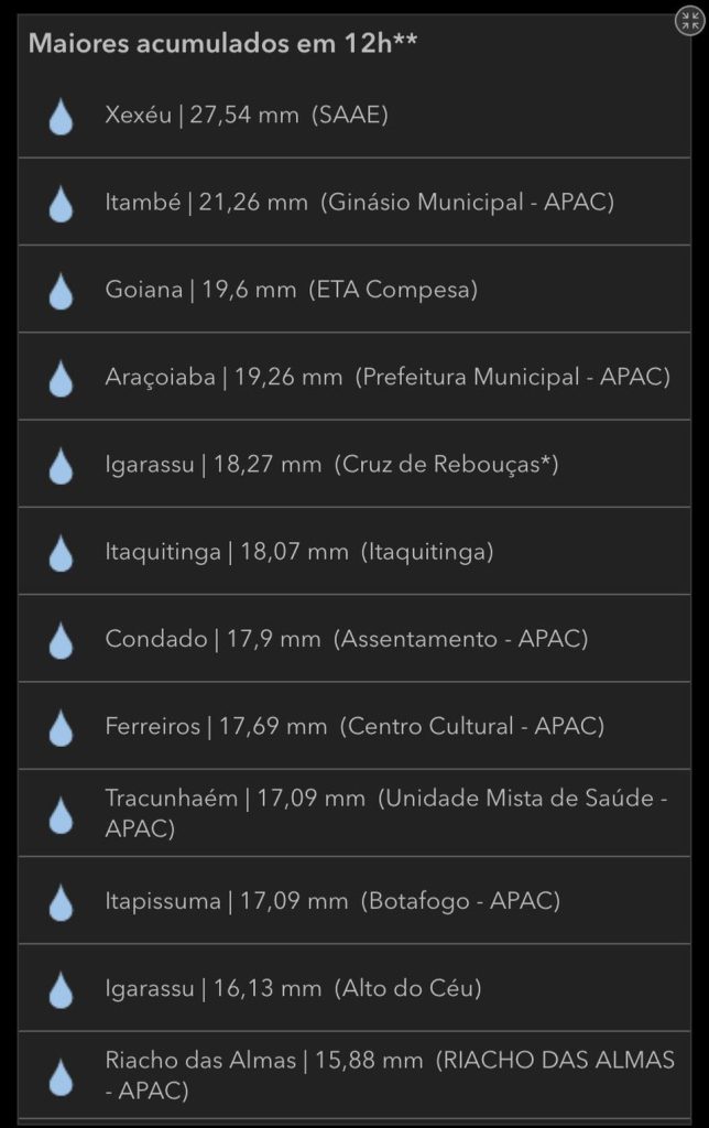 De acordo com a Apac, os maiores acumulados de chuva foram registrados nas seguintes localidades, nas últimas 12 horas: