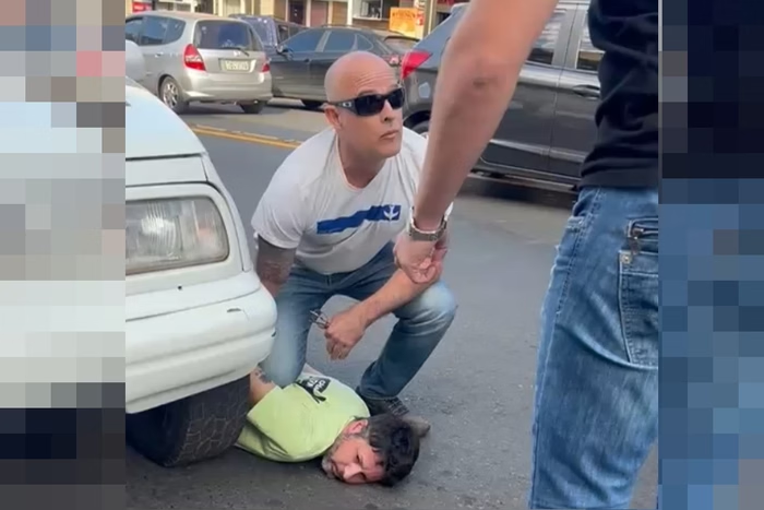 Em um trecho das imagens aparece um policial de camiseta branca e óculos escuros apoiando o joelho direito sobre as costas do motorista, que está no chão. Em seguida, os agentes levam o condutor a uma viatura da Polícia Civil do DF (PCDF).