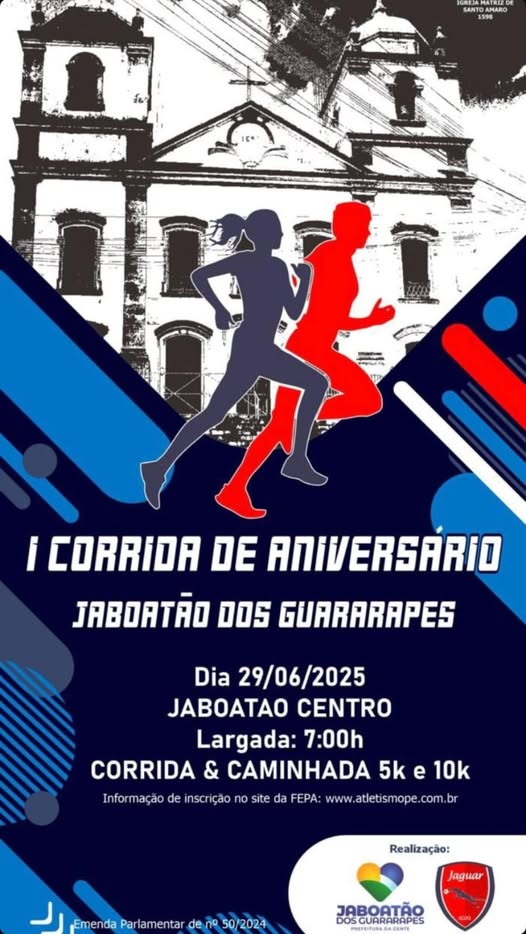 Neste domingo (29), a partir das 7h da manhã, atletas amadores e profissionais participam da 1ª Corrida de Aniversário do Jaboatão dos Guararapes. Com percursos de 5 km e 10 km, a largada será em frente ao Mercado da Cultura, na Praça de Nossa Senhora do Rosário, em Jaboatão Centro.